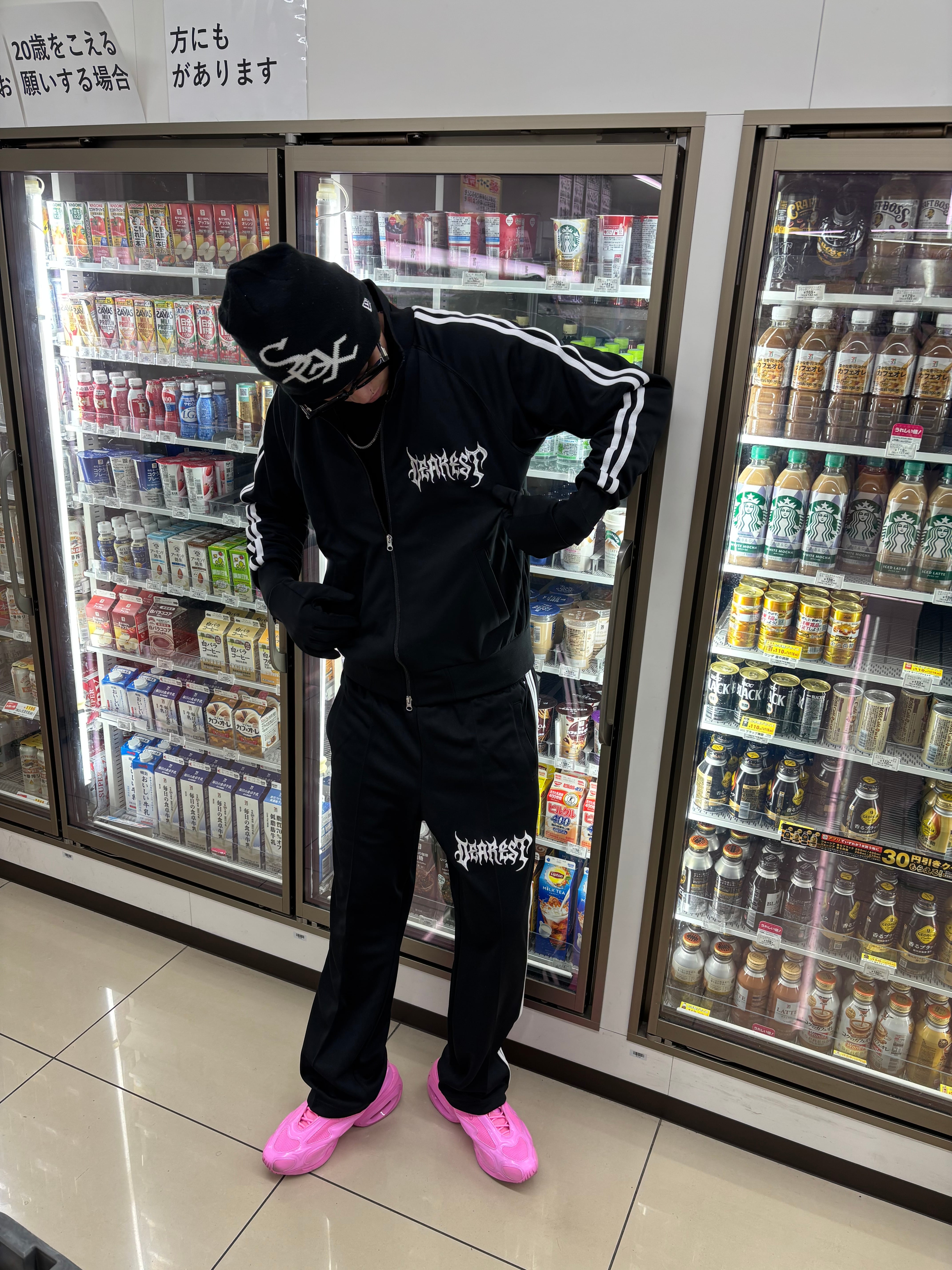スポーティなトラックジャケットを、DEARESTらしいダークなムードに落とし込んだ1着。