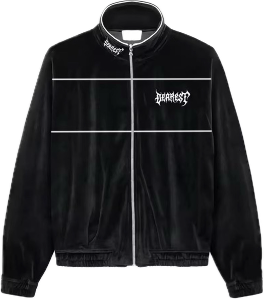 上品な光沢を放つブラックベロアに、ホワイトのラインを走らせた主役級トラックジャケット。