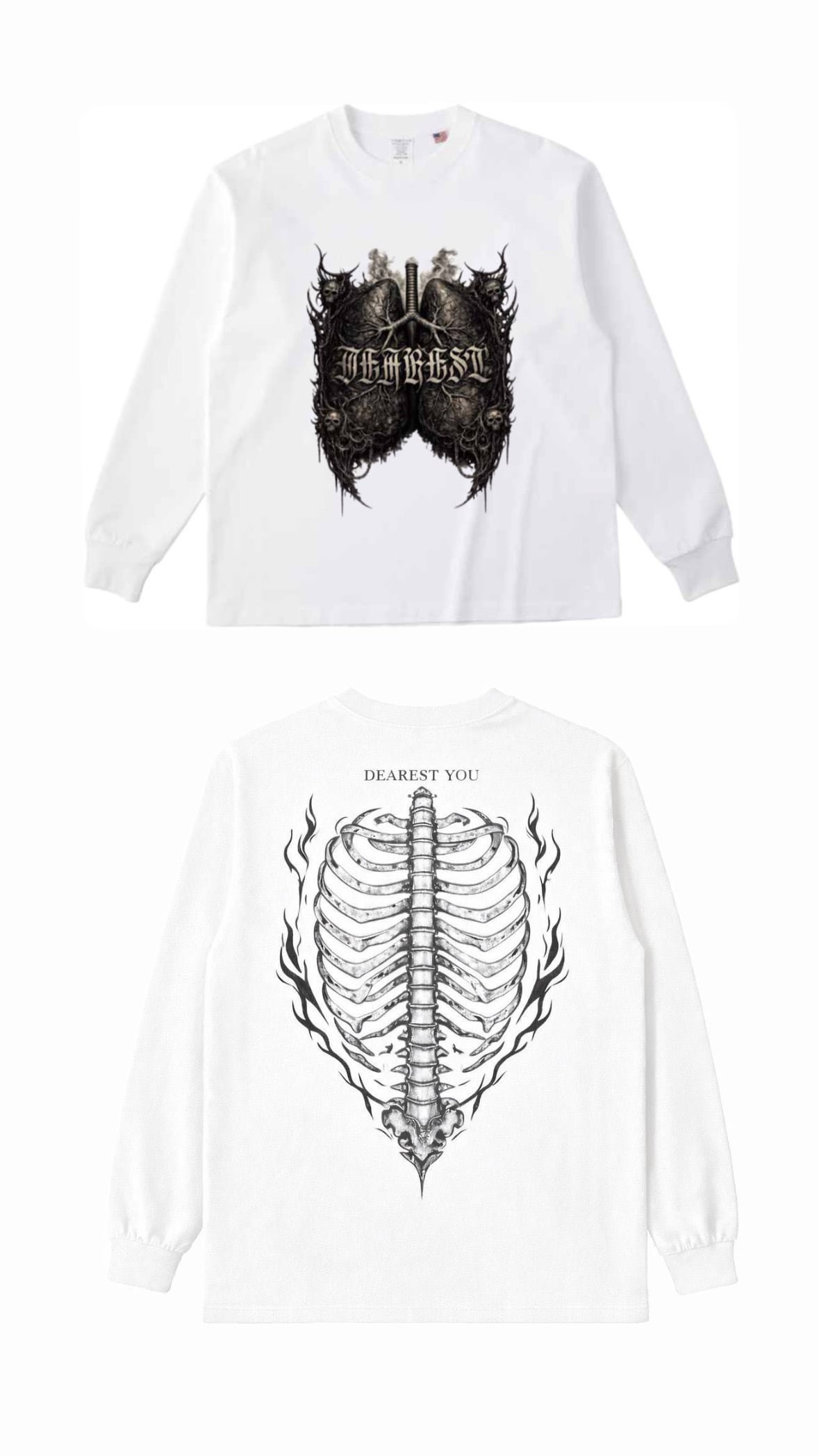 フロントには「DEAREST」の文字と左右対称の肺型バタフライデザイン、バックには「DEAREST YOU」の文字と炎に包まれたリブケージ(肋骨)をプリント。